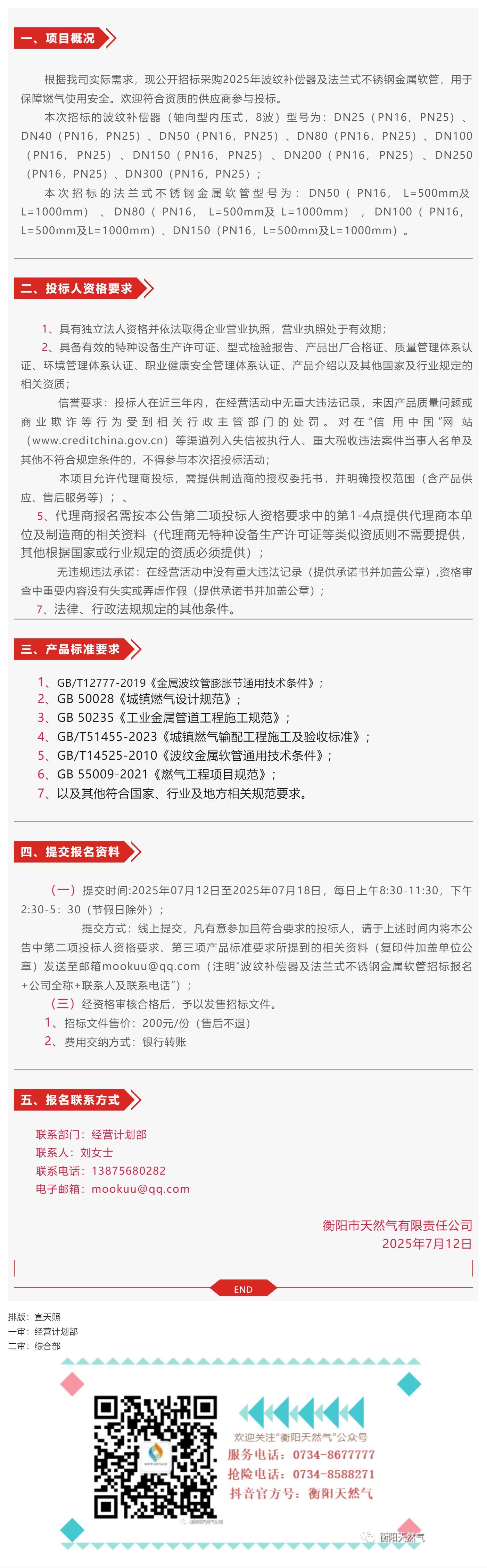 招標(biāo)公告丨衡陽市天然氣有限責(zé)任公司2025年波紋補(bǔ)償器及法蘭式不銹鋼金屬軟管采購(gòu)招標(biāo)公告